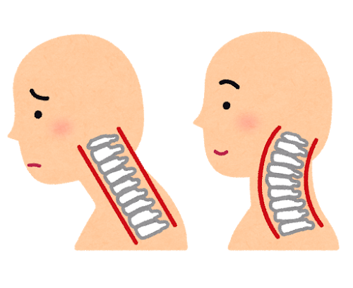 ストレートネックとは、頭が通常より前へ出た姿勢を続けることで、本来緩やかな前弯カーブを描くはずの首の骨(頚椎)の配列が、前弯が失われてまっすぐになった状態を指します。